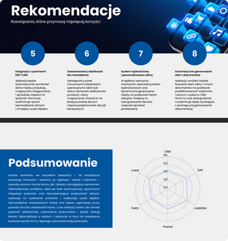 Po warsztatach otrzymujesz konkretne rekomendacje oraz spójny plan digitalizacji, który porządkuje decyzje i eliminuje przypadkowe inwestycje. Wiesz dokładnie, co robić dalej, w jakiej kolejności i z jakim celem biznesowym.